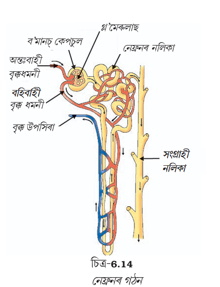 - গঠন: নেফ্ৰন হ’ল বৃক্কৰ গঠনমূলক আৰু কাৰ্য্যকৰী একক। প্ৰতিটো নেফ্ৰনত এটা কাপ-সদৃশ অংশ থাকে যাক ব’মেনচ্ কেপচুল (Bowman’s capsule) বোলে, যাৰ ভিতৰত ৰক্ত-কেশিকাৰ এক সমষ্টি (glomerulus) থাকে। ব’মেনচ্ কেপচুলৰ পৰা এডাল দীঘল, পাক খোৱা নলিকা ওলাই আহে যি শেষত সংগ্ৰাহী নলীত (collecting duct) লগ লাগে।